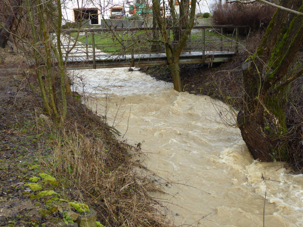 Der Starkregen der letzten Stunden hat den Fützener Dorfbach (Kommenbach) stark anschwellen