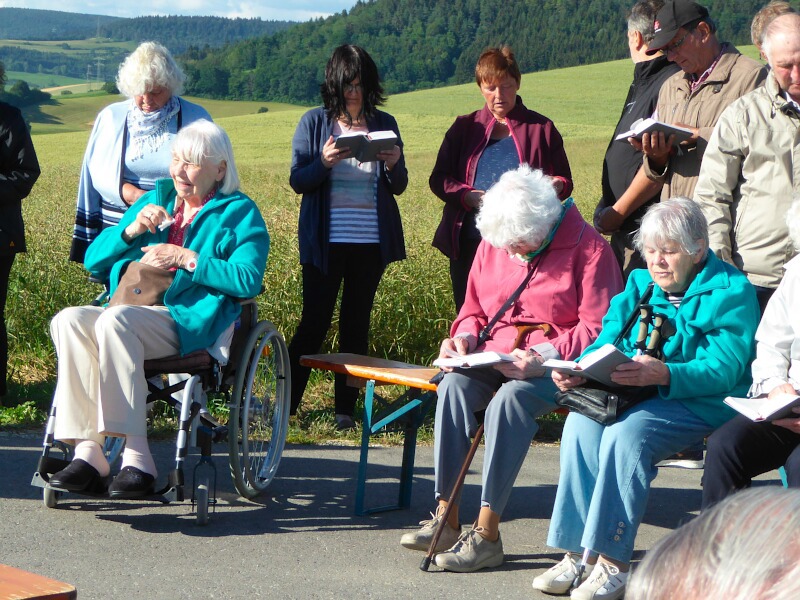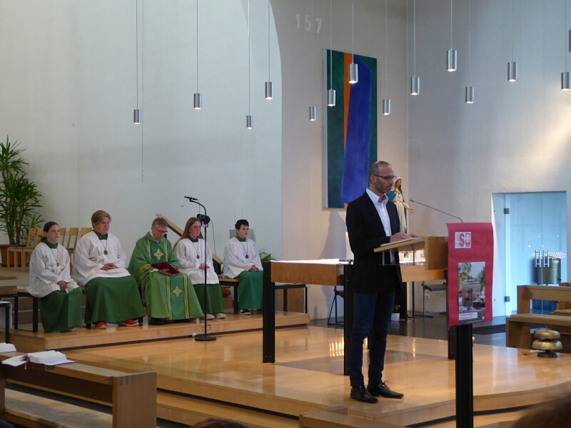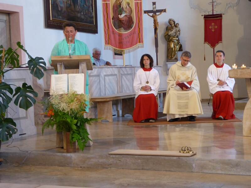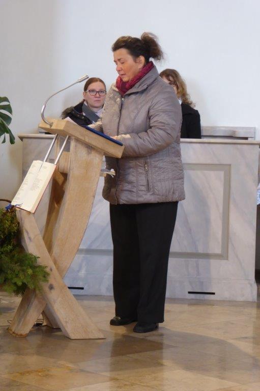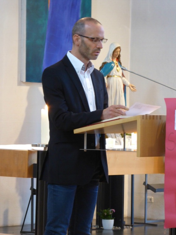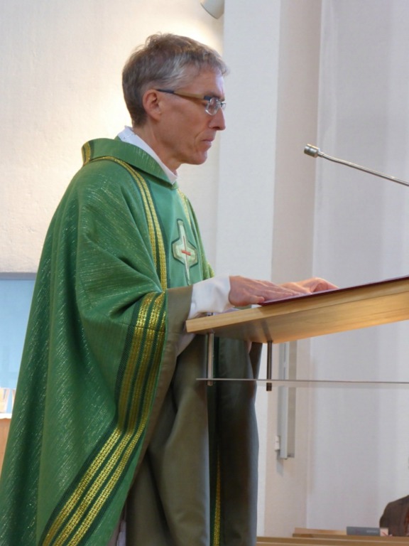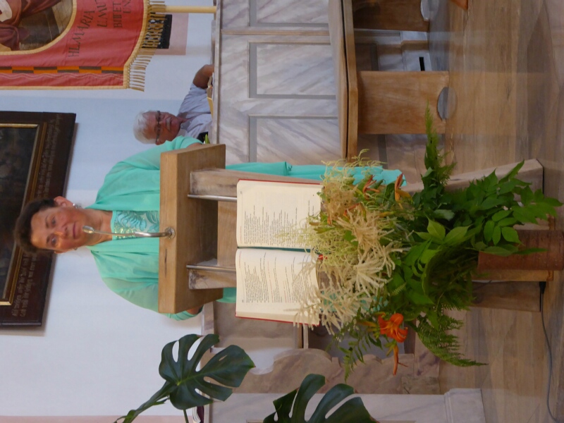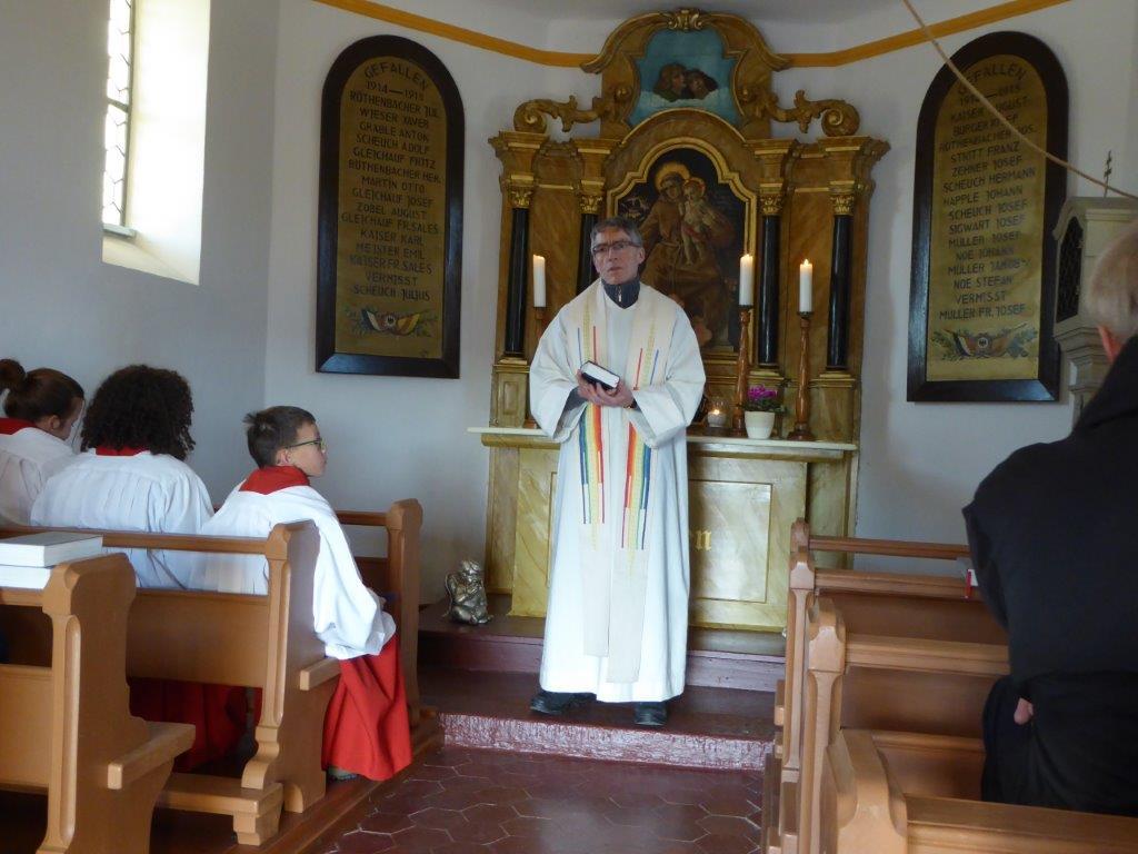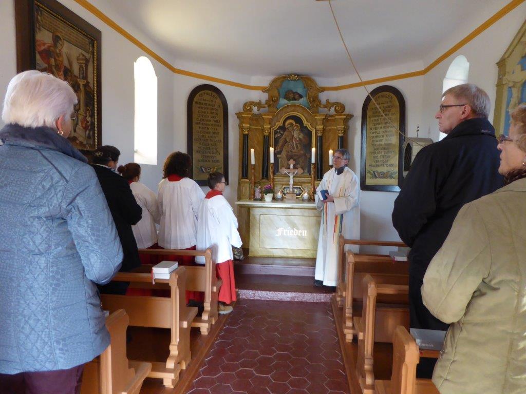 Pfarrer Karlheinz Brand hielt im Bezug auf die in der kleinen Kapelle reihum angebrachten Gedenk-und Votivtafeln eine bewegende und aufrüttelnde Ansprache. Lektorin Ursula Arlt las die Gebete und
