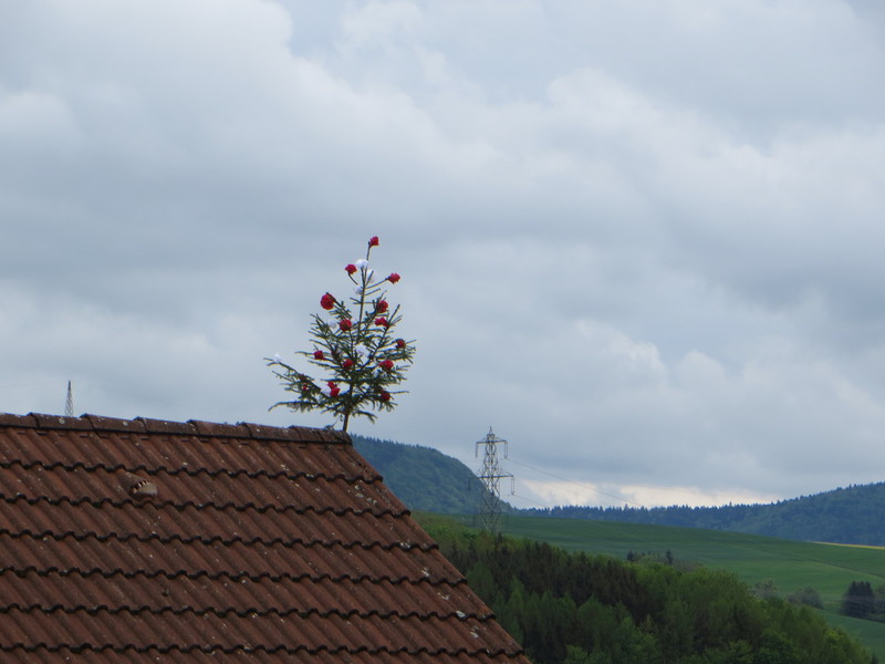 einen bunt geschmückten Maien auf den Dachfirst „pflanzen“.