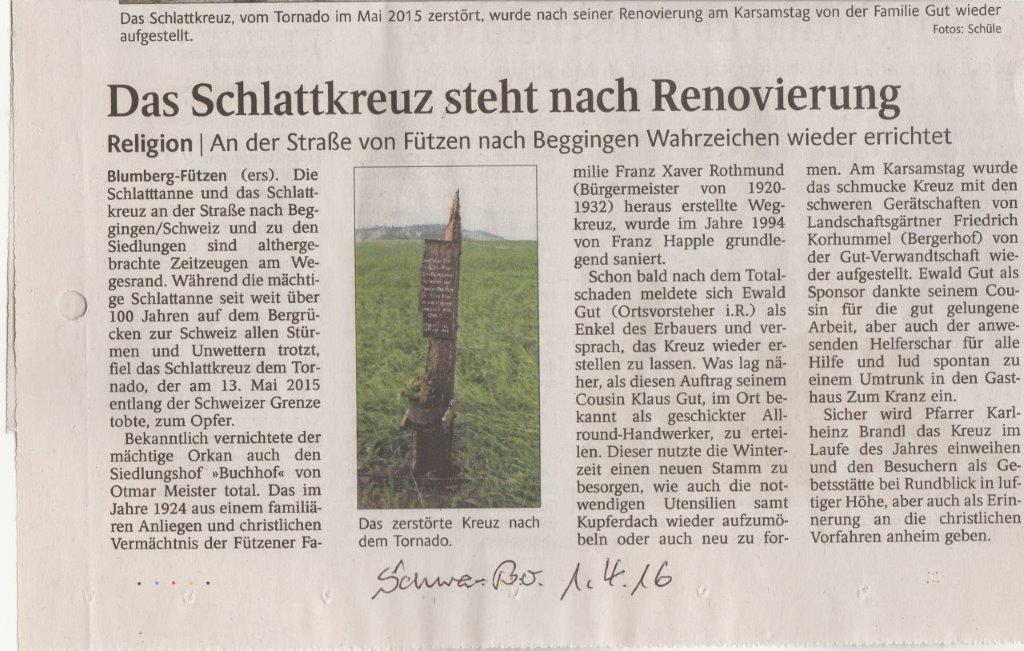 und legte einen Kranz an der Gedächtnisstätte nieder. Eine Abteilungswehr der Feuerwehr hielt die Ehrenwache. Mit dem Musikstück vom "Guten Kameraden", vorgetragen vom Musikverein Fützen unter der