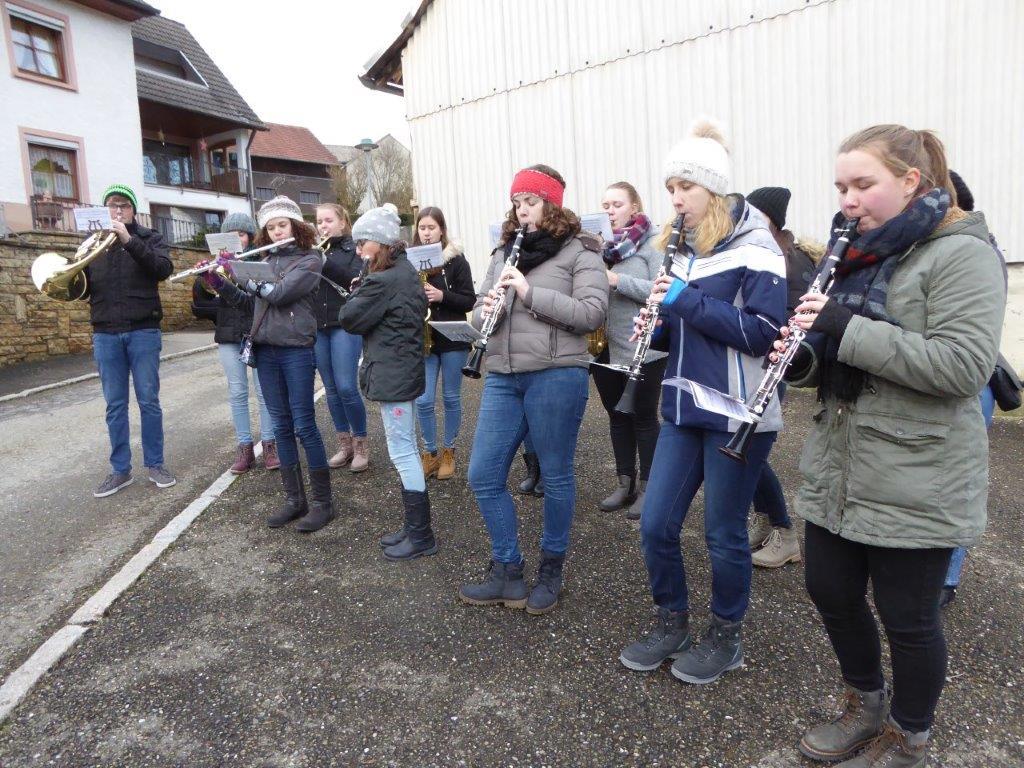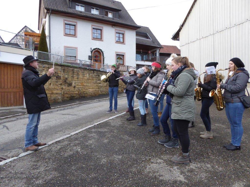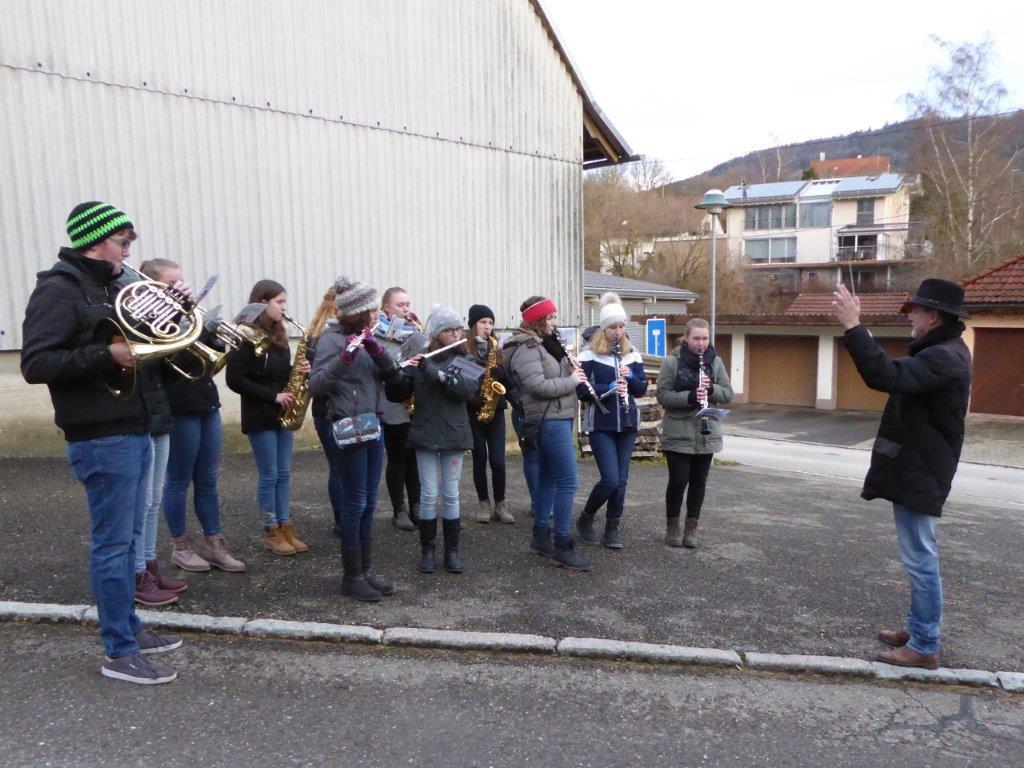 Jungmusiker durch das Dorf, um an markanten Plätzen mit ihren weihnachtlichen Weisen auf die Feiertage einzustimmen. Den Taktstock schwang der Leiter der Jugendkapelle Peter Meister.