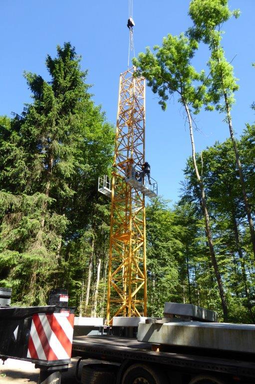vergangenen Tagen auf dem Hohen Randen einen 66 Meter hohen Kranmast der Firma Liebherr. Dieser soll temporär den bestehenden 80 Meter hohen Mast während der Umrüstzeit entlasten.