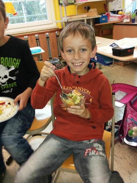 geschnippelt und gemischt, um einen leckeren Obstsalat herzustellen. Den Bildern ist unschwer zu entnehmen, dass den Schülern die süße Kreation ausgezeichnet mundete.