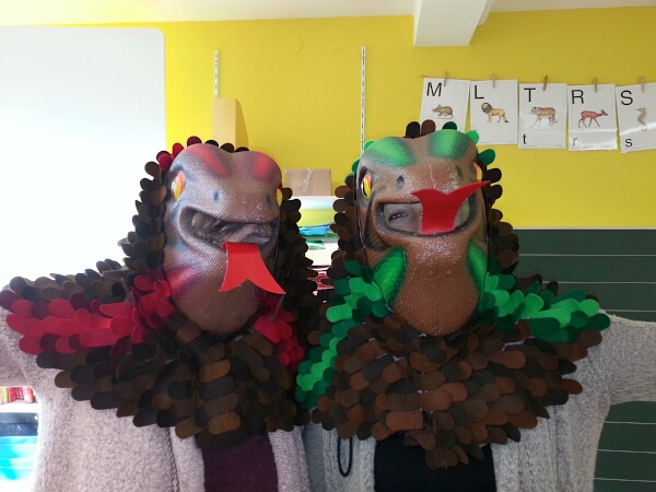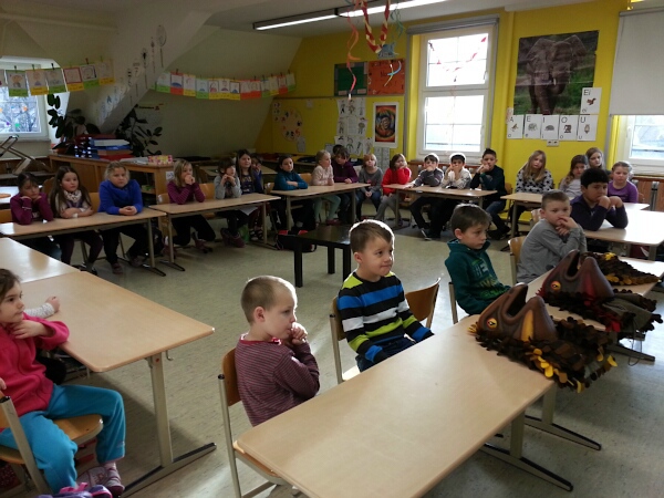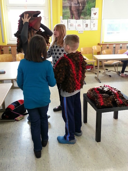 Am Montag, den 1. Februar 2016 waren bei uns in der Schule das Eggäsli und der Narrenvater zu Besuch. Die Fasnet ist ja schon in vollem Gange. Da wurde es höchste Zeit, dass die Eggäsli in unserer Schule vorbeischauen und uns ihr Häs vorstellen. Das Häs ist nämlich die Verkleidung der Narren und die Erwachsenen tragen sogar eine Maske.