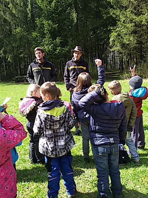 Gemeinsam mit den beiden Förstern Patrick Egle und Matthias Berger ging es zur Randenhütte oberhalb von Fützen. An verschiedenen Stationen konnten die Kinder den Wald erkunden und lernten so
