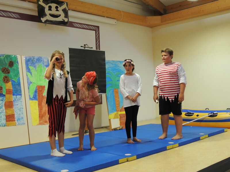 Zunächst aber galt es fröhlich Abschied zu nehmen und die Tür zu den Ferien weit aufzustoßen. In einem gut einstudierten Theaterstück „Auf der Reise ins Abenteuerland“, suchten die als Piraten