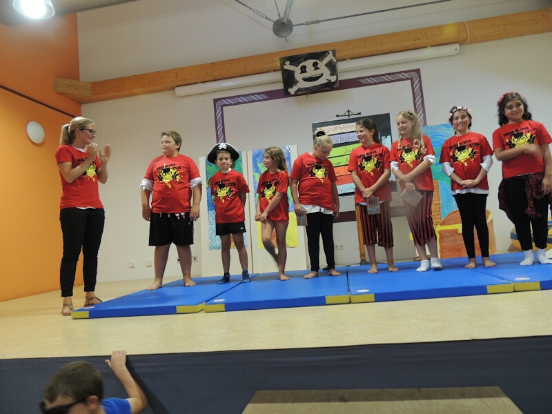 auftretenden Schüler erwartungsgemäß mit ihrem Boot nach einem verborgenen Schatzkoffer. Dabei gab es bei den Zwischenstationen immer wieder akrobatische Turneinlagen. Schließlich aber wurde der